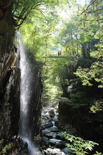 渓谷内に5つある滝の1つ「竜神の滝」です。落差12mの滝は、太陽の光によって7色に