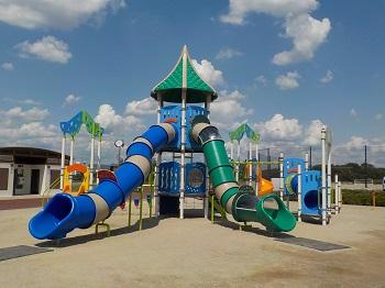 公園の西側には天然の芝生広場、東側には多目的に利用できるグラウンド、中央には幼児用と