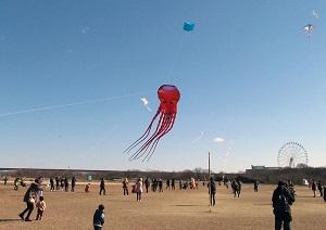 大勢で協力して一緒にあげる大型の凧、海のタコの